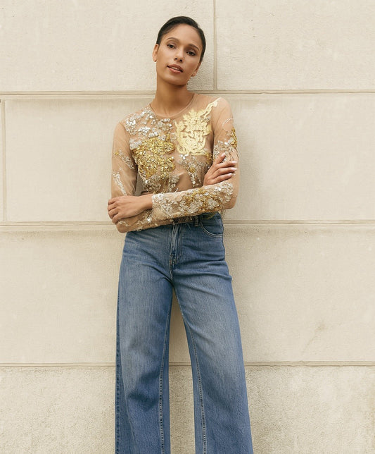 ADIBA Hand Beaded Floral Sequence Mesh Top Size S