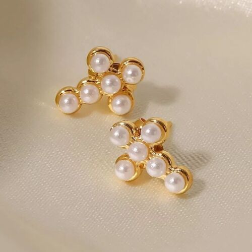 Gold Plated Stainless Steel Pearls Cross With Stud Earring