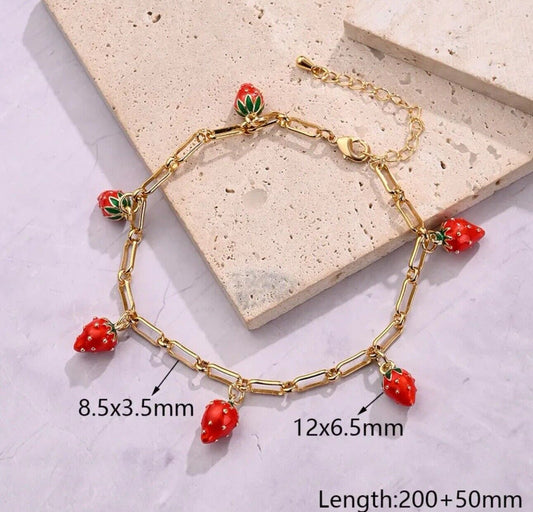 18k Gold Plated Copper Red Enamel Strawberry Charms Bracelet