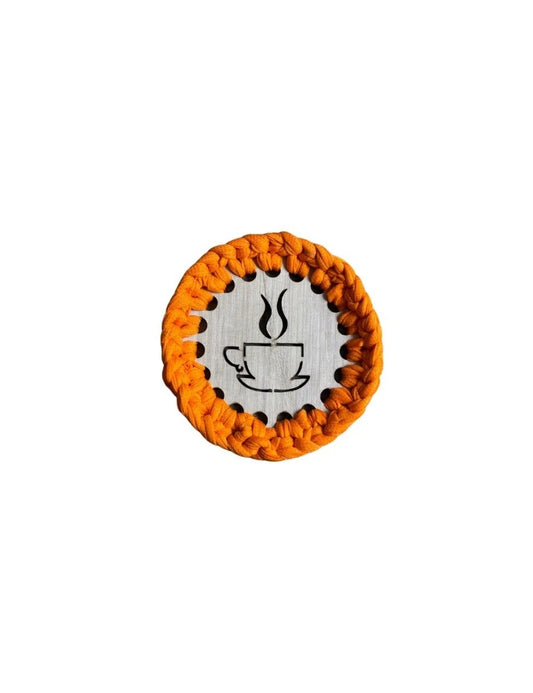 Orange Handmade Crochet And Wood Coffee Round Coaster Set