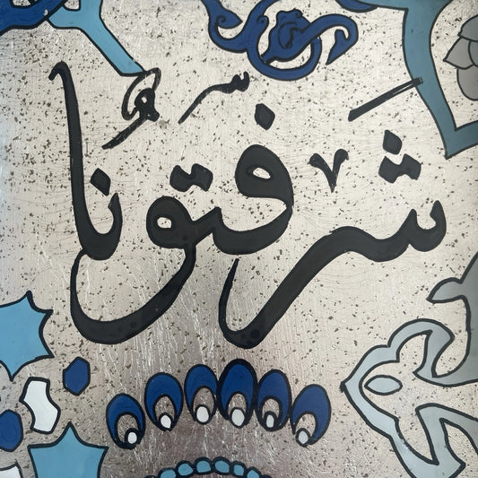 Handmade Wooden Glass Mediterranean Welcome Arabic Writings Blue Squared Tray