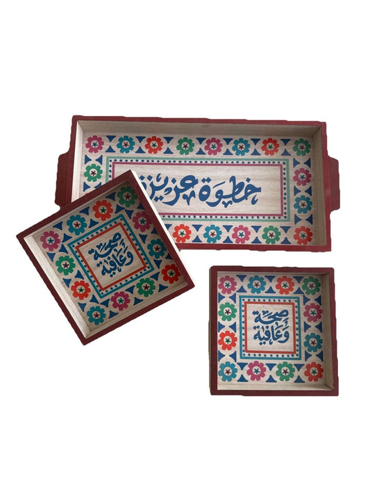 Handmade Mediterranean Welcome Arabic Writings Colorful 3 Piece Set Tray