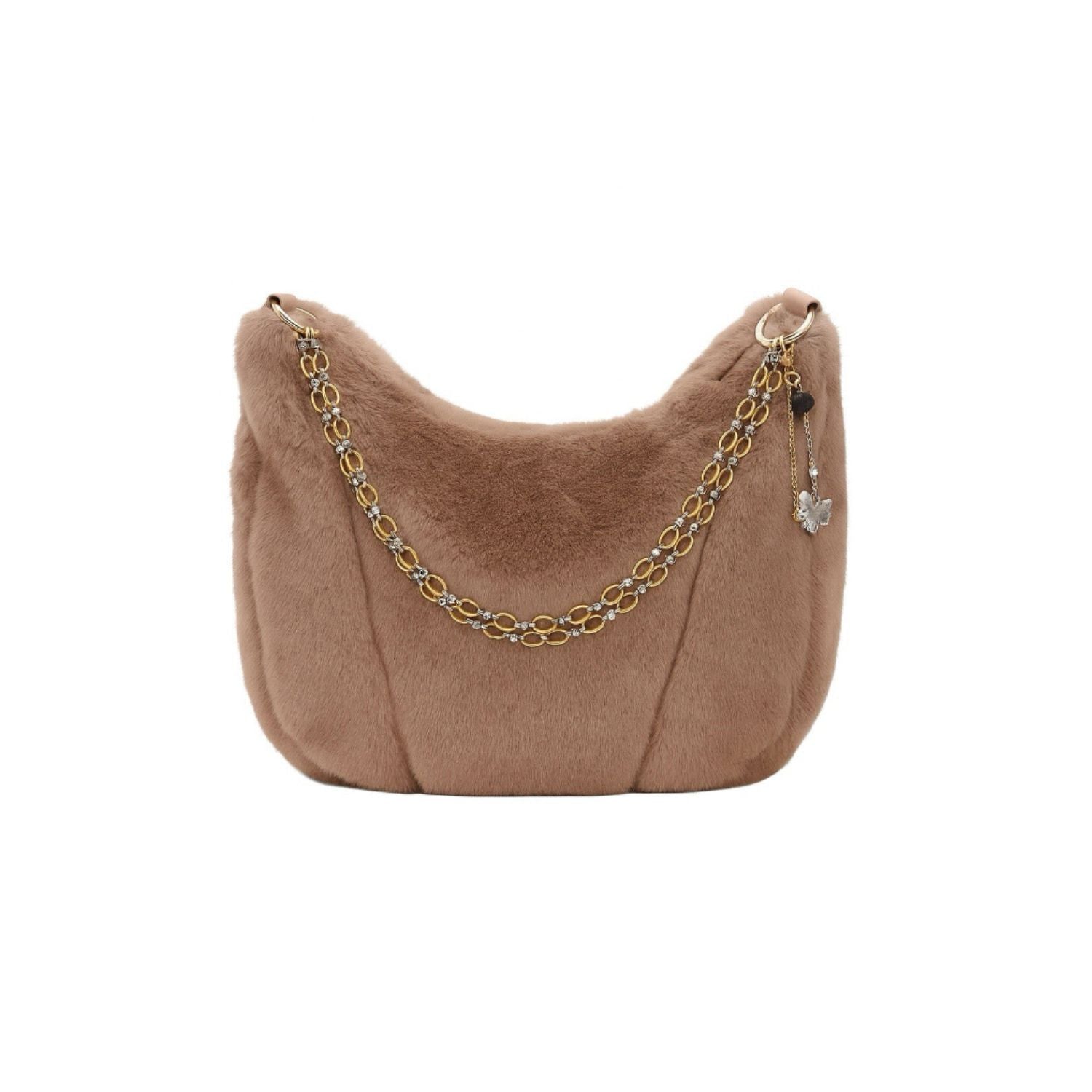The Beige Handmade Faux Fur Shoulder Chains Purse is a stylish and unique accessory for women. Made from polyester with a solid pattern, this medium-sized shoulder bag features a zip closure and a gold handle/strap. The exterior color is beige, with a matching lining, and it comes with a bag charm. The purse is versatile and perfect for everyday use, adding a touch of luxury and flair to any outfit