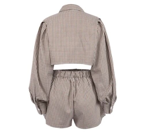 This stylish Brown and White Plaid Matching Top and Shorts in Size S is perfect for any occasion. The set includes a long-sleeved shirt with button accents and a colorful 90s theme, paired with comfortable shorts. The fabric is made of a blend of Polyester and Spandex, making it durable and stretchy.