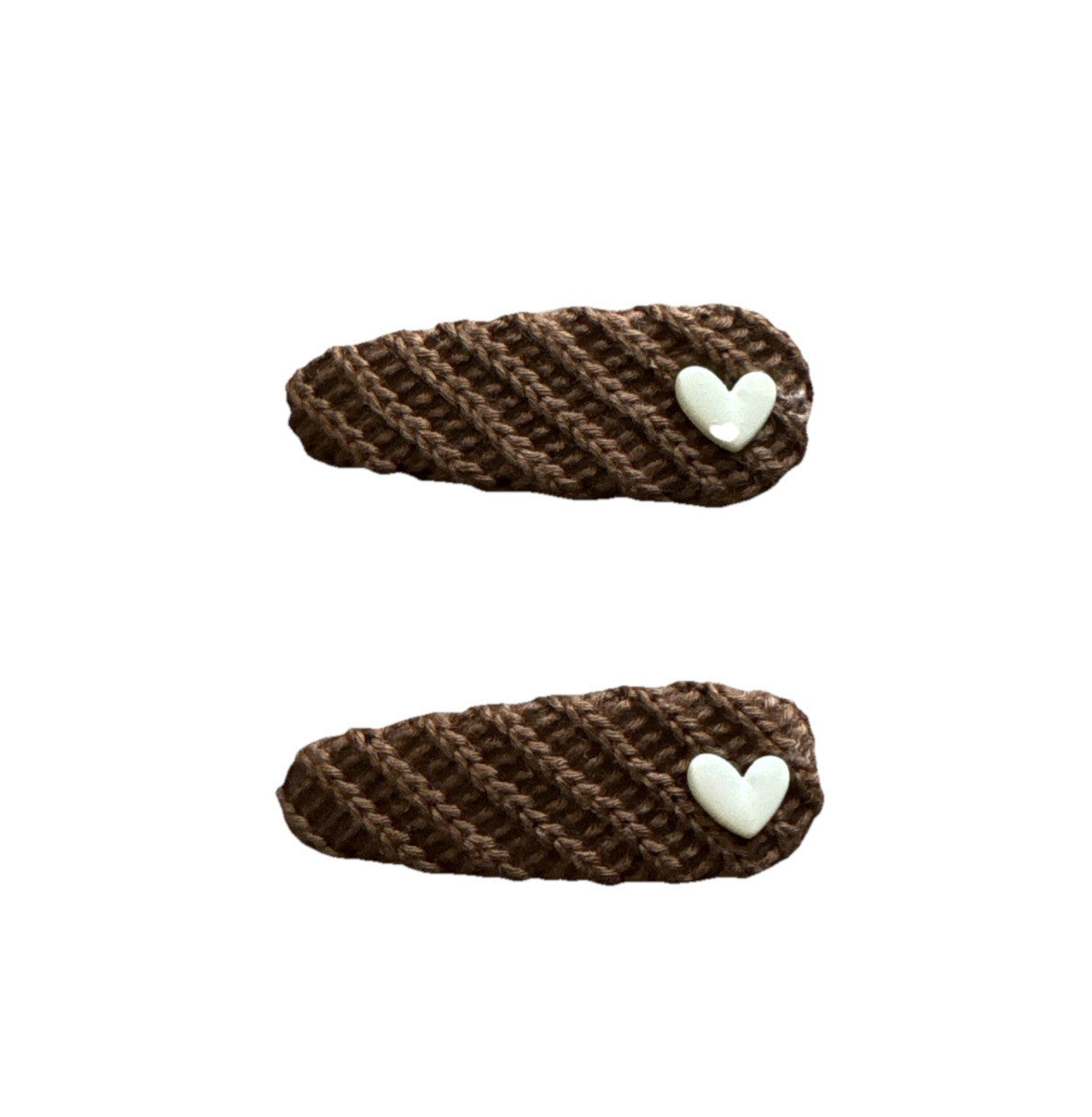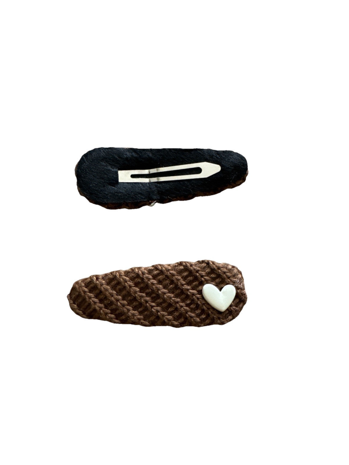 Brown Oval Heart Crochet Fabric 2 Piece Hair Clip Set