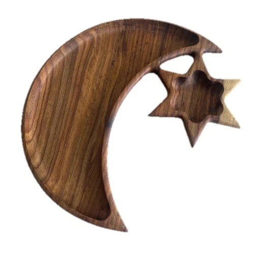 The Brown Wooden Moon and Star Snacks Tray is a unique and charming serving tray with a solid brown color and a moon shape. Made from wood with a matte finish, this medium-sized tray features two compartments, making it easy to organize snacks or appetizers. The moon and star theme adds a whimsical touch to the design, making it a stylish and functional addition to any home or dining area. It is a versatile piece that can be used for serving a variety of snacks or desserts.