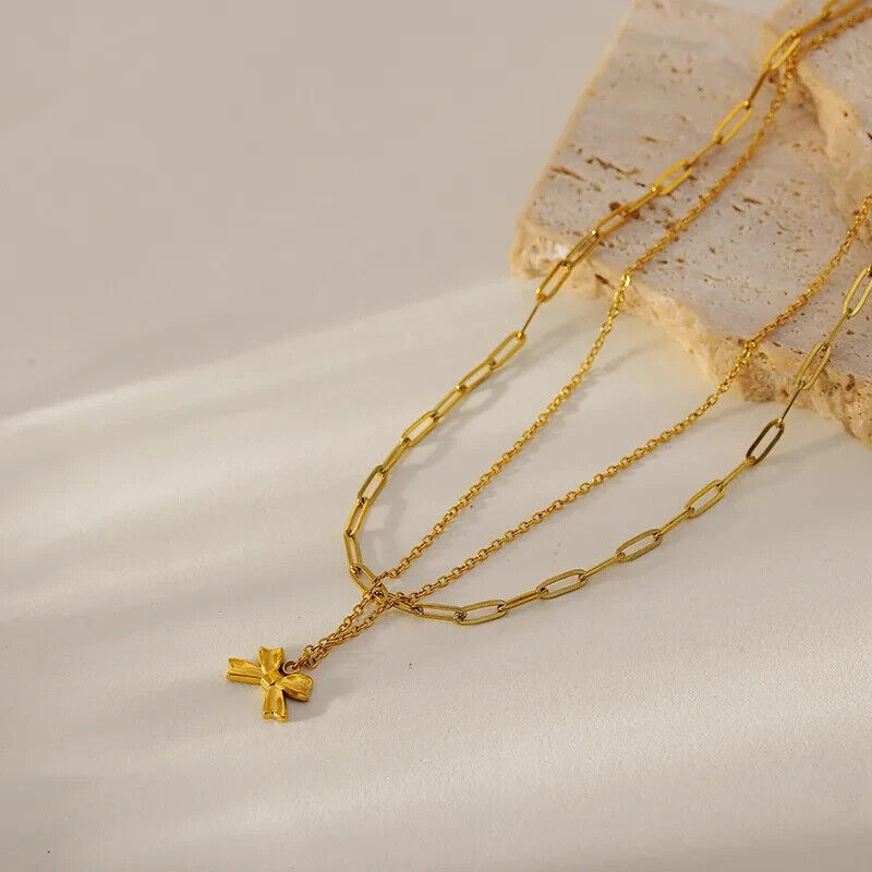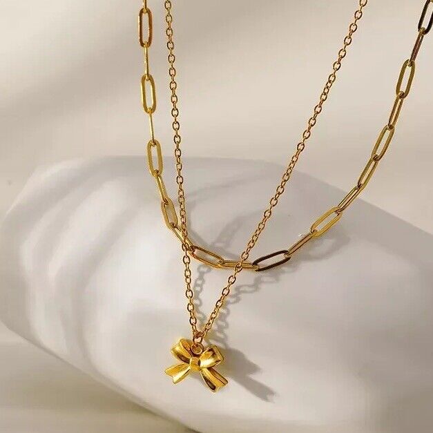 Gold Plated Stainless Bow Pendant Double Chain Necklace