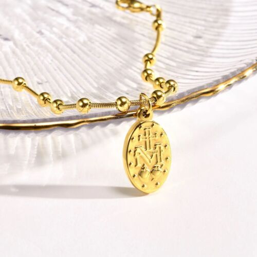 Gold Plated Virgin Mary Pendant Stainless Steel Rosary Style Chain Bracelet