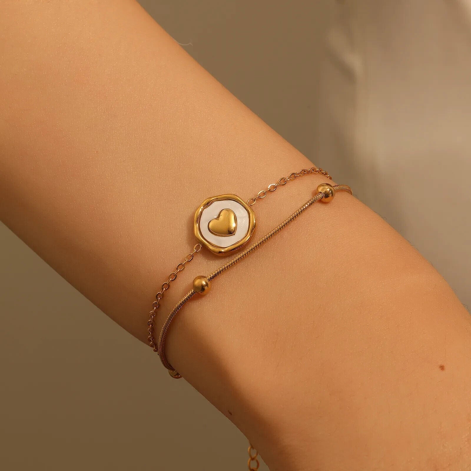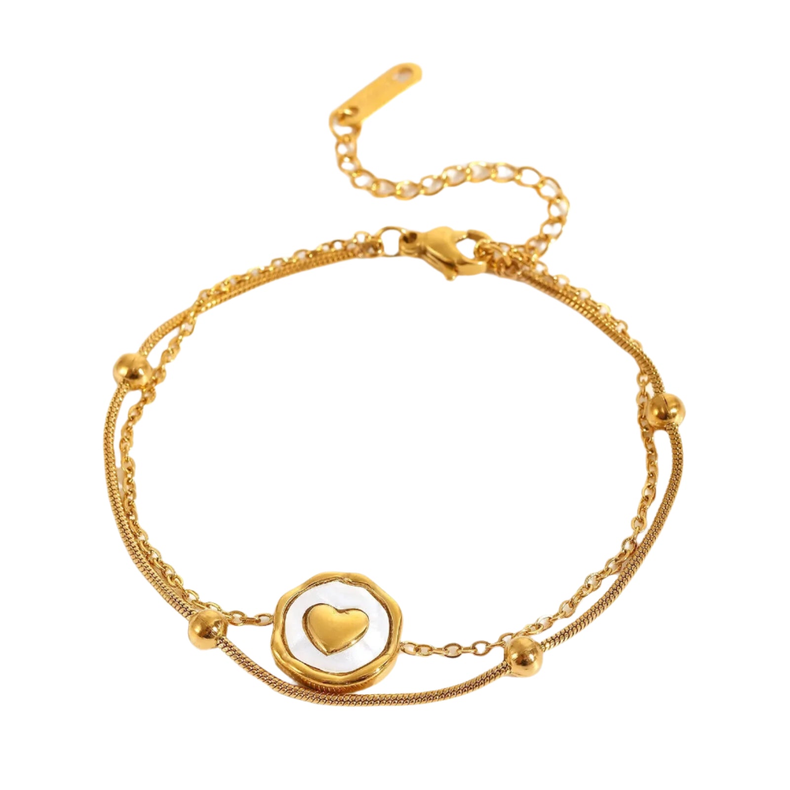 Gold Titanium Steel And White Enamel Heart Charm Double Chain Bracelet