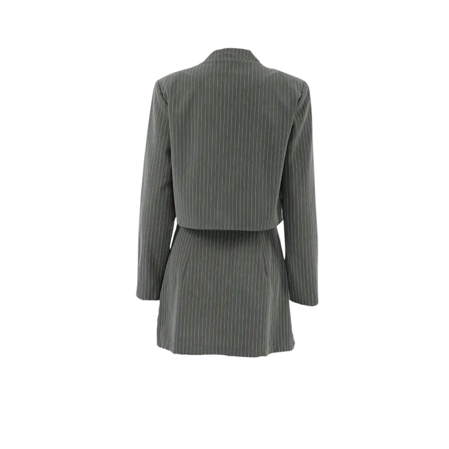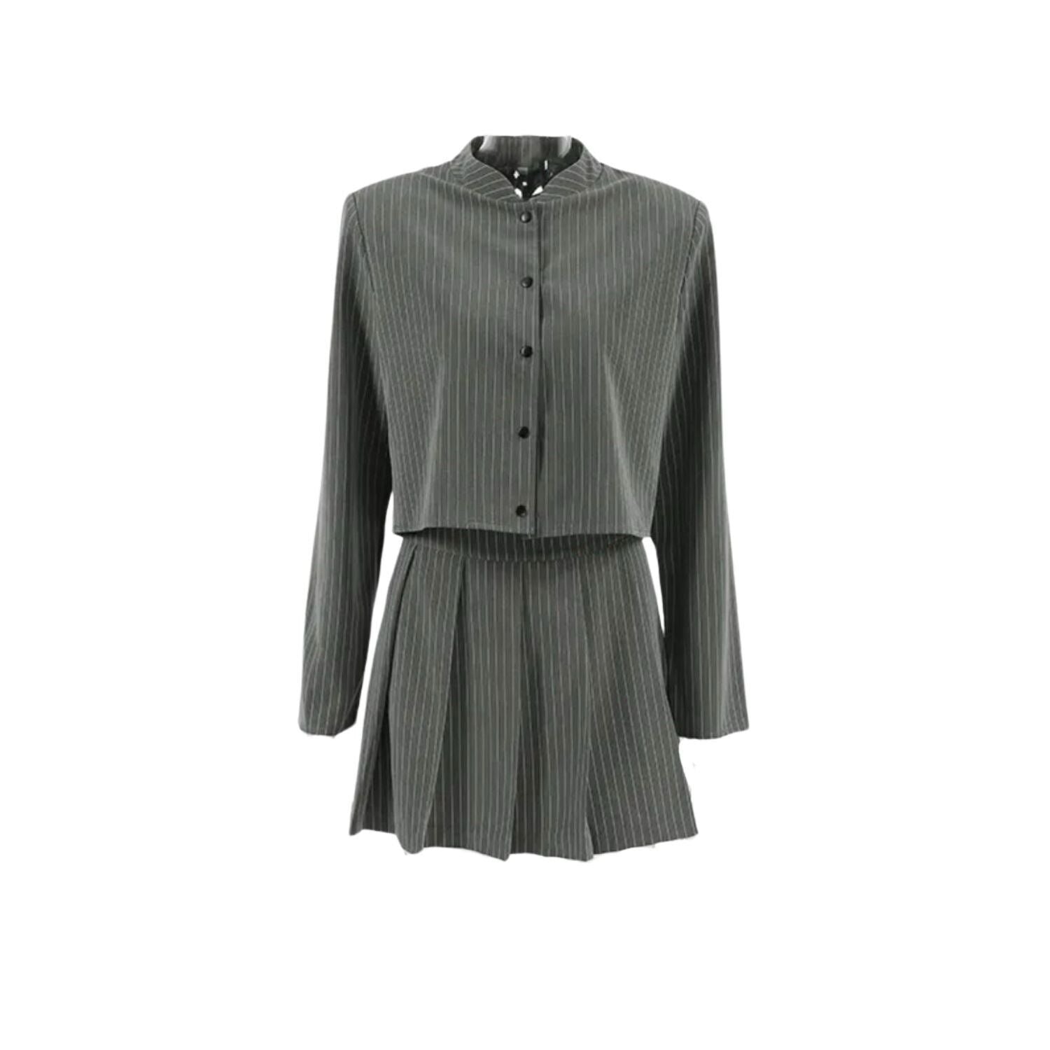 Grey Striped Matching Pleated Skirt And Long Sleeves Jacket Size S
