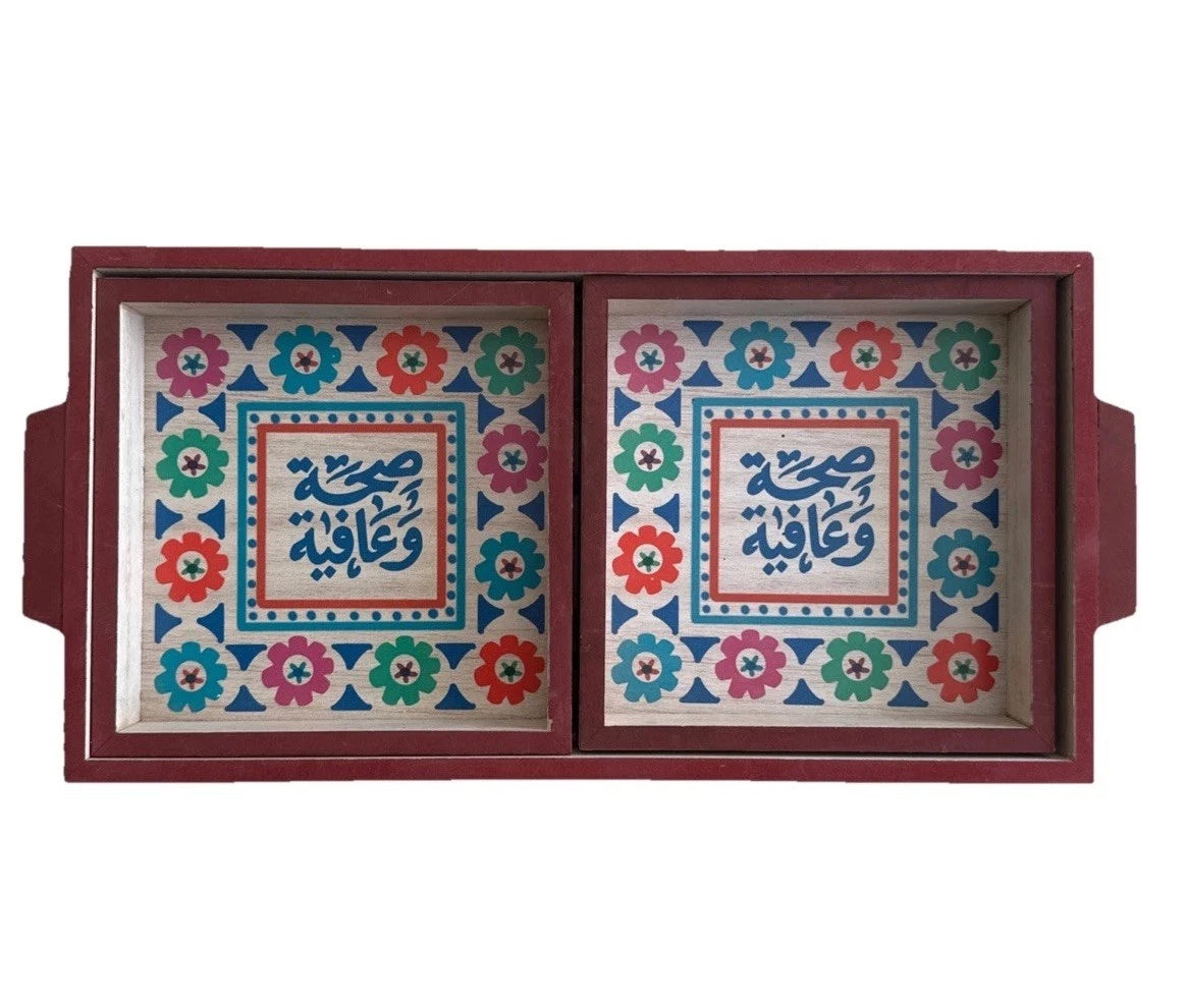 This handmade Mediterranean Welcome Arabic Writings Colorful 3 Piece Set Tray is a stylish and unique addition to any home. Made of wood with a matte finish, the rectangle-shaped serving tray features abstract Arabic writings in a colorful design. With 2 compartments, this medium-sized tray is perfect for serving drinks or snacks in a Mediterranean-inspired style. Imported from Egypt, this tray adds a touch of elegance and culture to your dining or living space.