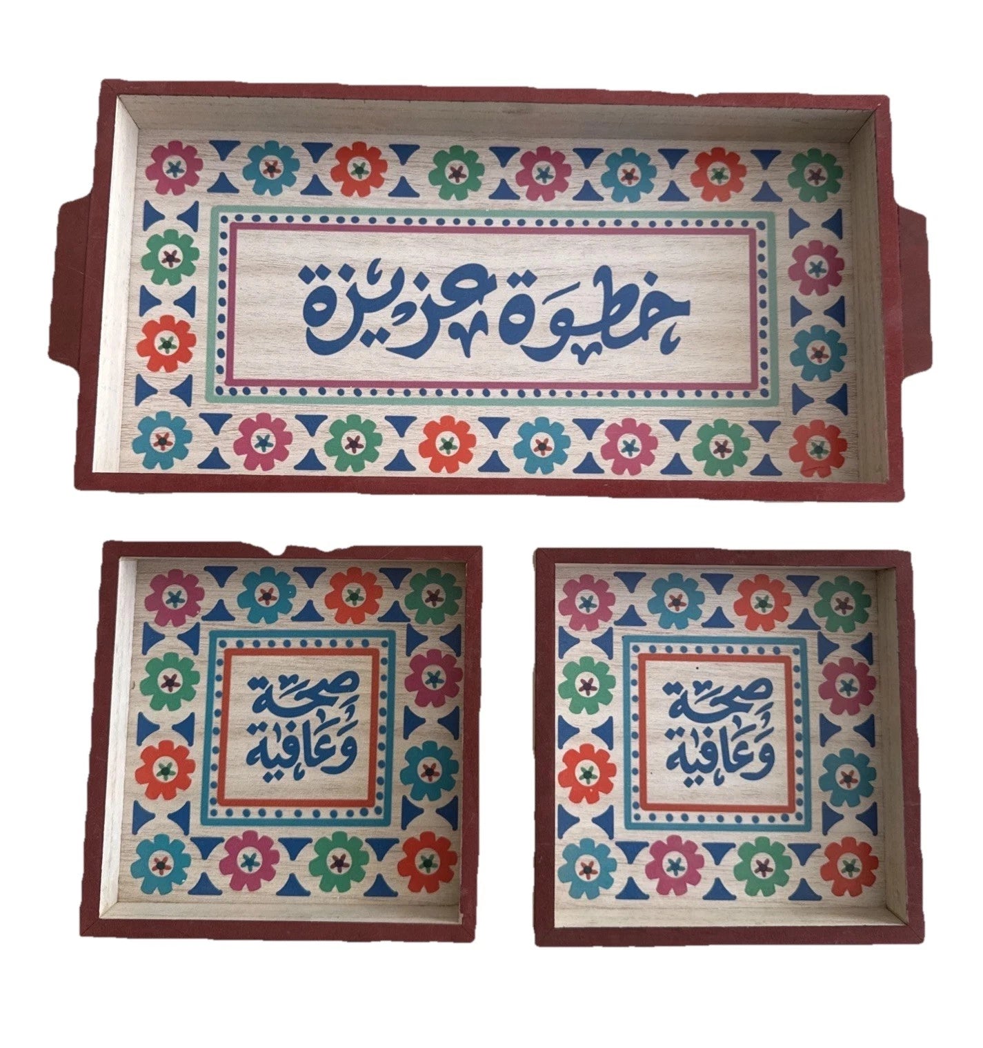 Handmade Mediterranean Welcome Arabic Writings Colorful 3 Piece Set Tray