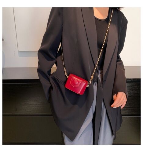 This mini crossbody bag/purse is a stylish addition to any outfit. The exterior is made of faux leather and metal, with a solid red color and art-themed design. It features a square shape, measuring 3.9" in width, 2.7" in height, and 1.9" in depth.