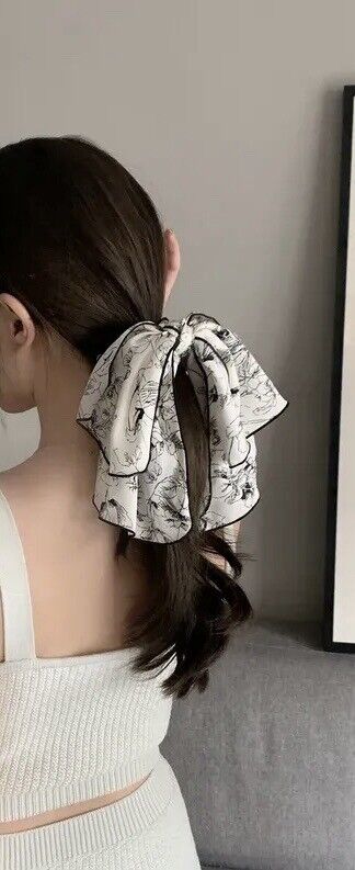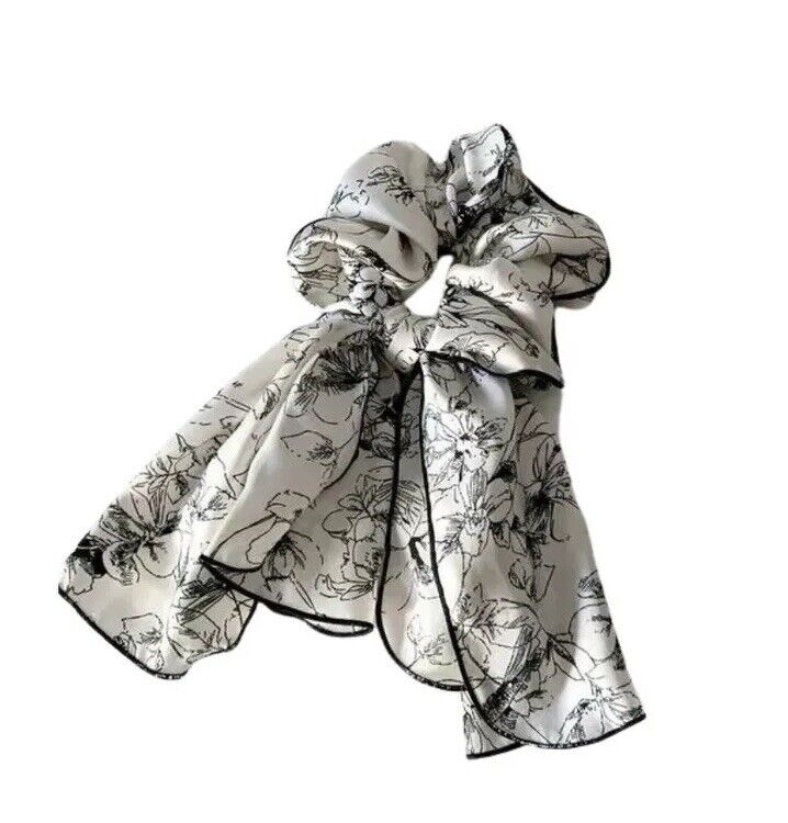 White And Black Printed Floral Pattern Knotted Hair Tie Ribbon