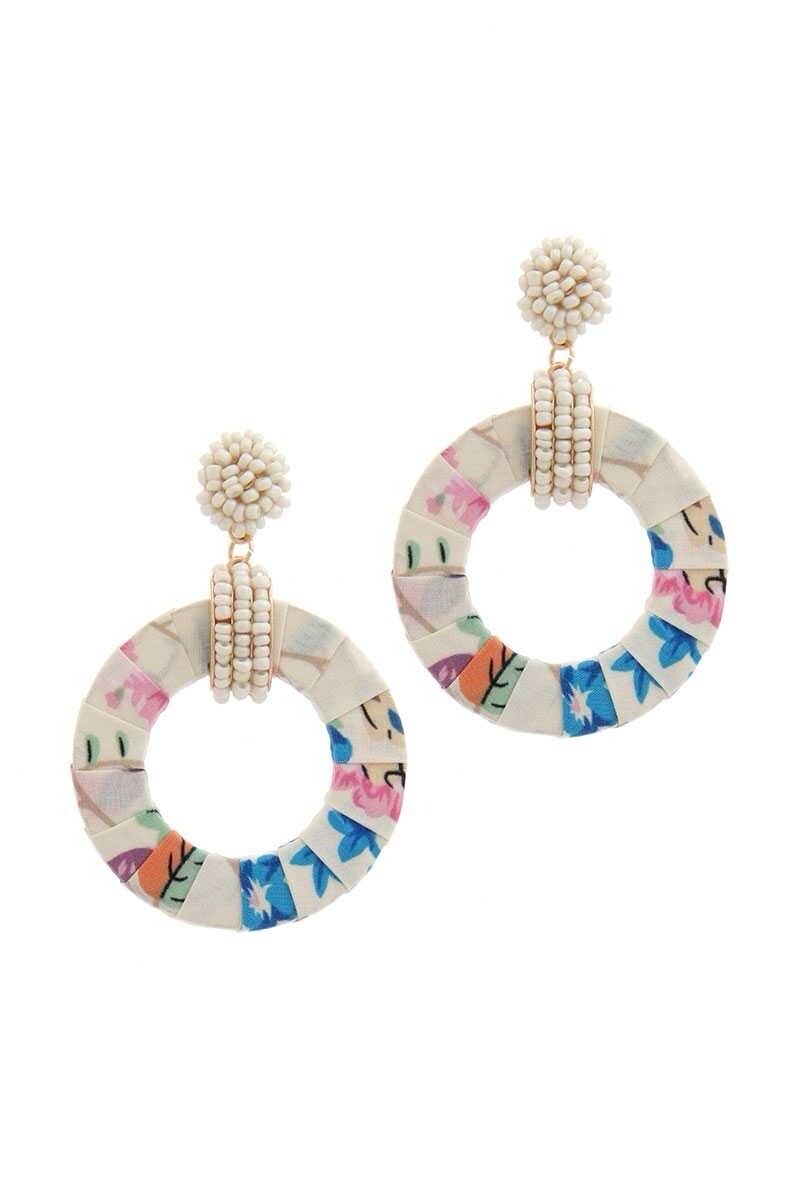White And Colorful Resin Beaded With Floral Fabric Drop hoop/ Round Earrings