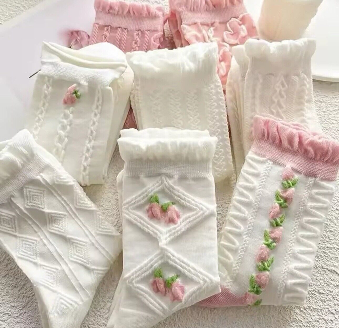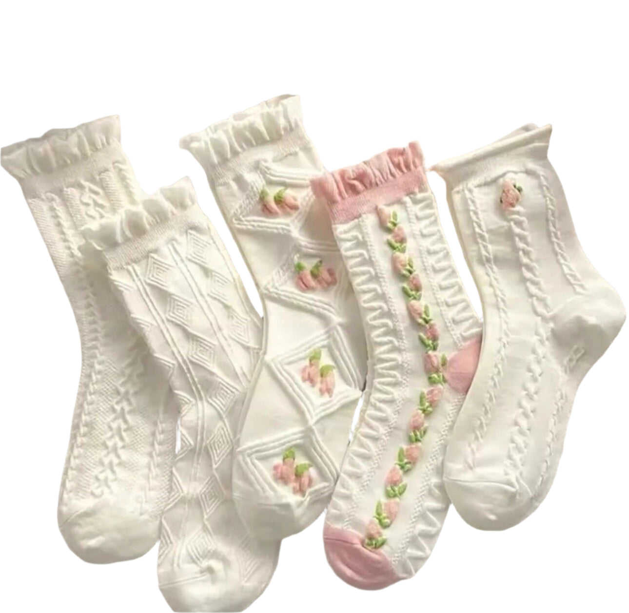 White And Pink Retro Style 5 Pair Women Floral Socks