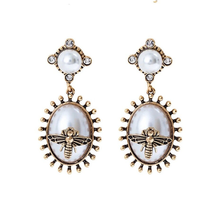 White Enamel Bee And Imitation Pearl Drop Earrings