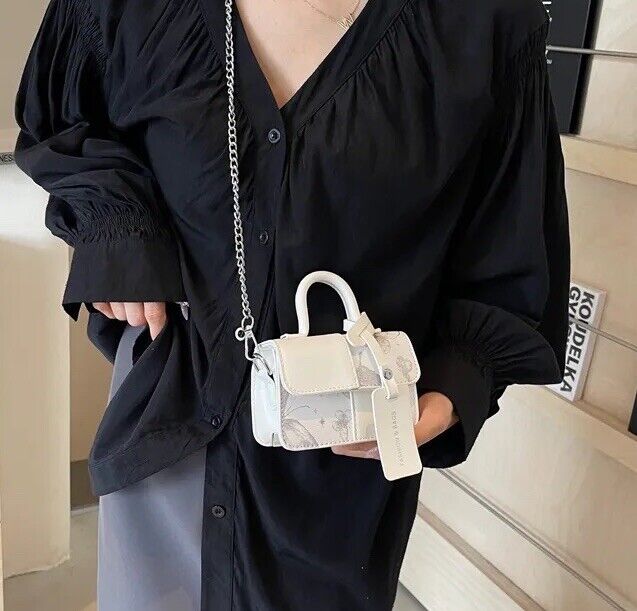 This stylish and trendy mini crossbody bag/purse is perfect for any occasion. It features a beautiful white and silver lavender floral and butterfly design on faux leather and metal exterior material. The bag has a square shape with a magnetic, button, and a cross-body strap for easy carrying.